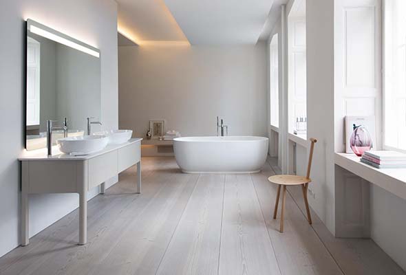 在浴室设计方面,Philippe Starck 始终坚持将简约、雅致的表面与精心挑选的卫浴产品相结合的原则。浴室的墙面和地面同样铺设了浅色意大利大理石。浴缸嵌于一块大理石块中,面朝一扇大窗。窗外的热带风景为您的沐浴享受平添了一丝惬意。Duravit 斯达克 1 系列脸盆置于大理石台面上。此外,Philippe Starck 还为不同的 Duravit 系列设计了浴缸和座便器。